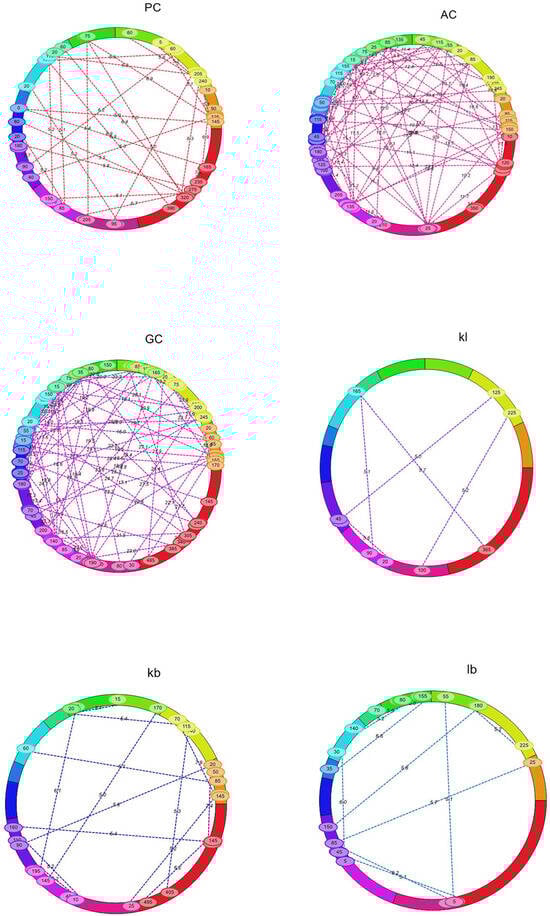 A total of 331 significant epistatic QTLs were detected for GPC, AC, GC, KL, KB, L:B, PTPP, and GYPP at a threshold LOD score > 5, with PVE ranging from 0.56 to 10.18% (Table S3). At LOD > 5, we found minor interactions between multiple loci across chromosomes (Figure 5). We detected 28 digenic interactions for GPC. Interestingly, three of these interactions occurred between a significant main-effect QTL (RM562-RM11307) in chromosome 1 for GPC and non-significant loci in other chromosomes. These interactions are represented in the boxplots (Figure 6). Both additive effects were from JAK-686 (Table S3). Similarly, we detected 79 epistatic interactions for AC. Three of these interactions occurred between two significant main-effect QTLs (RM22-A03P09039 and RM562-RM11307) on chromosome 3 and 6, respectively, and non-significant loci in other chromosomes (Figure 7). The influence of additive-by-additive effects of epistatic QTLs was relatively lower compared to the individual additive effects of the corresponding QTLs. This could be due to the presence of few individuals with rare loci in the populations. Further, interference from other loci and the limited epistatic variance arising from interactions may also contribute to this effect.