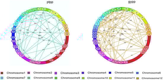 Epistatic QTLs for protein, yield, and quality traits in F2 population by IM-EPI (PC—grain protein content; AC—amylose content; GC—gel consistency; kl—kernel length; kb—kernel breadth; lb—L:B; ptpp—productive tillers per plant; gypp—grain yield per plant).