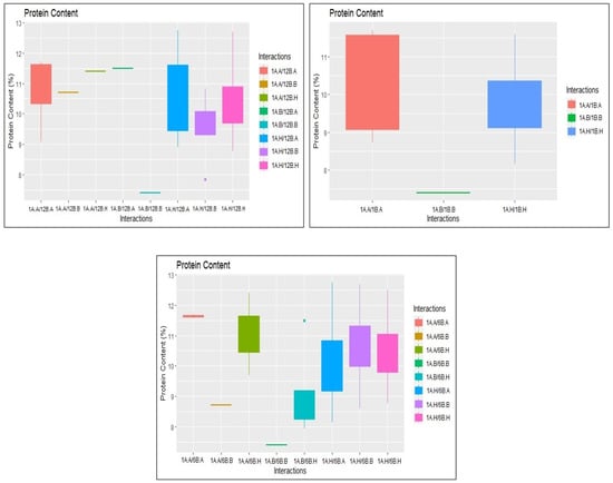 Box plots illustrating the epistatic interactions for protein content on chromosomes 1A (RM562-RM11307) and 12B (RM27564-A12P02180); 1A (RM562-RM11307) and 1B (RM11307-RM10890); 1A (RM562-RM11307) and 6B (A06P22133-A06P08188) A, JAK-686 allele; B, BPT 5204 allele; H, heterozygous.