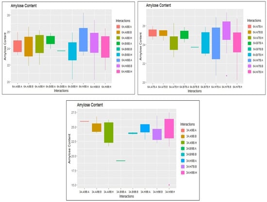 Box plots illustrating the epistatic interactions for amylose content on chromosomes 6A (RM3408-RM586) and 8B (RM23556-A08P25335); 6A (RM3408-RM586) and 7B (RM21652-RM1132); 3A (RM22-A03P09039) and 9B (RM13021-A09P12377).