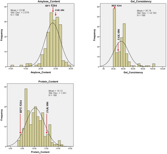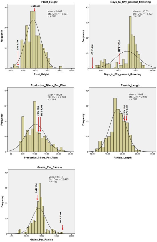 Frequency distribution plots for GPC, grain quality, yield, and yield attributing traits showed transgressive segregants for all the traits in one or both directions (Figure 8, Figure 9 and Figure 10). This could be due to the combination of favorable and unfavorable alleles from the parents, ‘BPT 5204’ and ‘JAK-686’. Using phenotypic data from the F2 population, a normal distribution and significant variability was observed, suggesting polygenic inheritance of the traits. The GPC ranged between 7.2% (F2-186) and 14.7% (F2-140), with an average GPC of 10.1% among the F2 population. Five F2 plants, F2-140, F2-12, F2-7, F2-147, and F2-41, had high GPC values of 14.67%, 14.36%, 14.32%, 13.60%, and 13.36%, respectively. Additionally, their respective GYPP values were 29.03 g, 19.12 g, 16.54 g, 25.90 g, and 15.87 g (Table 4).