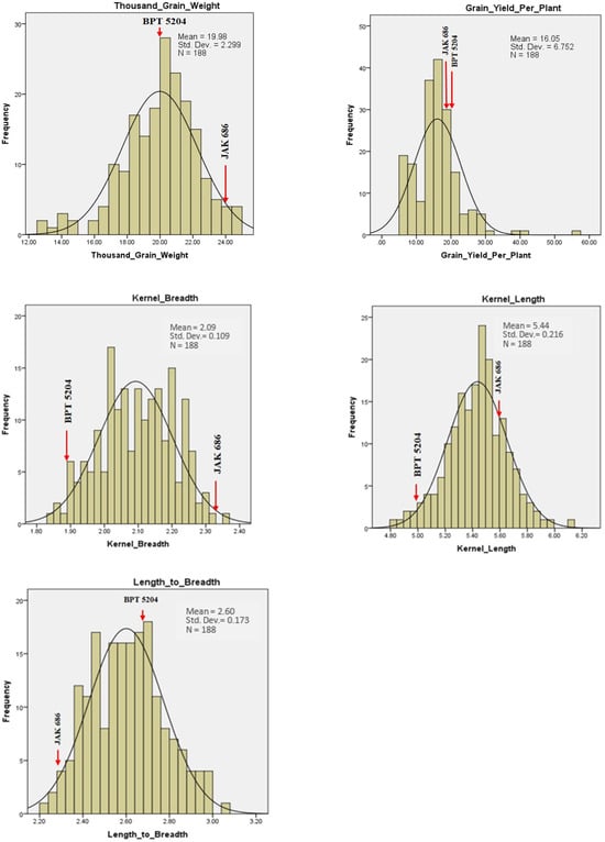 TGW, DFF, and AC exhibited high heritability coupled with moderate GAM. Heritability greater than the genetic advance indicates the influence of environment []. We can improve such traits by intermating superior genotypes in the segregating population developed by combination breeding []. PH, PTPP, PL, GPP, GYPP, and GC exhibited high heritability and high GAM. Chaudhari et al. (2007) [] also observed similar results. Since additive gene action largely influences these traits, the potential for their improvement is through direct selection. Accordingly, selection based on these traits is more reliable. GPC exhibited moderate heritability and GAM. This study is consistent with the results of Bruno et al. (2017) [], suggesting a moderate heritability of protein with higher variation in the population compared to that in the parents due to environmental interaction. Low heritability and GAM were observed for KL, KB, and L:B. These results agree with those reported in other studies [,,]. High heritability coupled with high GAM indicates that most of the heritability is due to additive gene action, making selection potentially effective. Hence, among the thirteen traits studied, selection is effective for PH, PTPP, PL, GPP, GYPP, and GC. Selection for these traits would improve the genotypic value of the selected plants beyond that of their parents [].