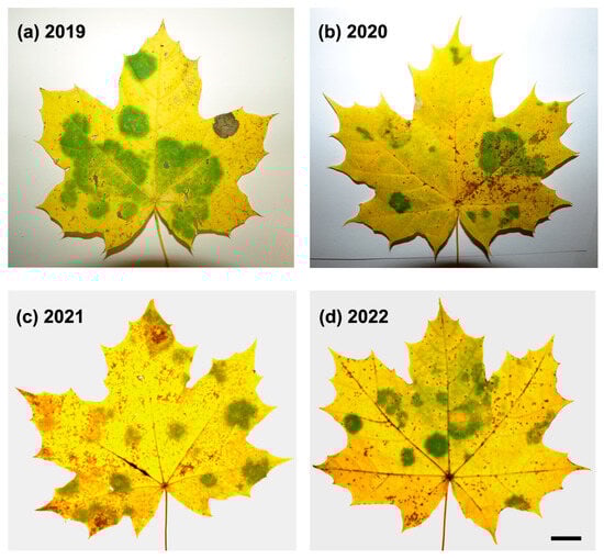 Figure 1. Representative images of A. platanoides senescent leaves with ‘green islands’ symptoms harvested in October/November in the years 2019–2022. (d) bar = 10 mm.