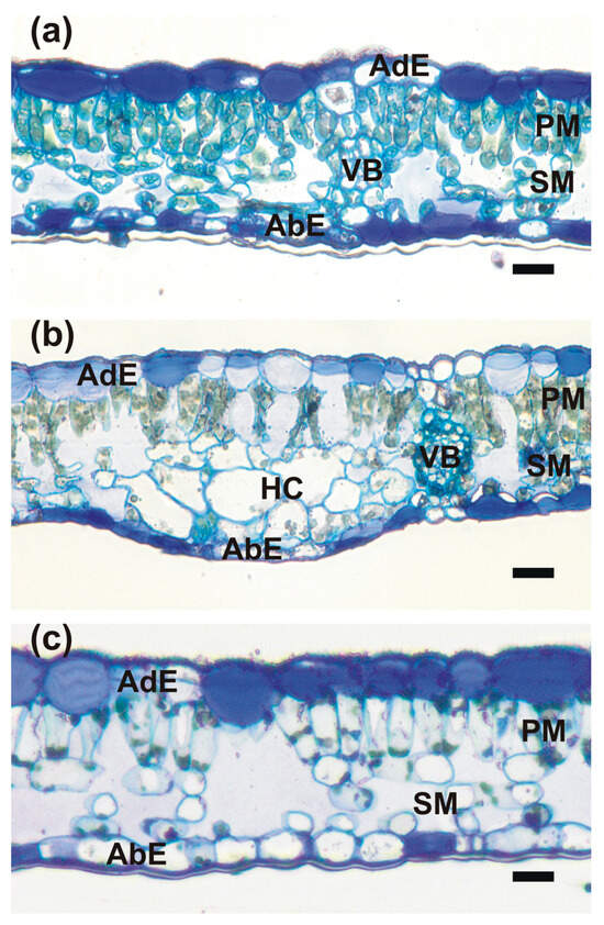 Figure 2. Light microscopy images of Toluidine Blue-stained sections taken from the following: (a) mature summer leaf; (b) ‘green island’ induced on autumn senescent leaf; (c) the yellow area of a senescent leaf. Abbreviations: AbE, abaxial epidermis; AdE, adaxial epidermis; HC, hypertrophied cells; PM, palisade mesophyll; SM, spongy mesophyll; VB, vascular bundle. Scale bars: 20 μm.