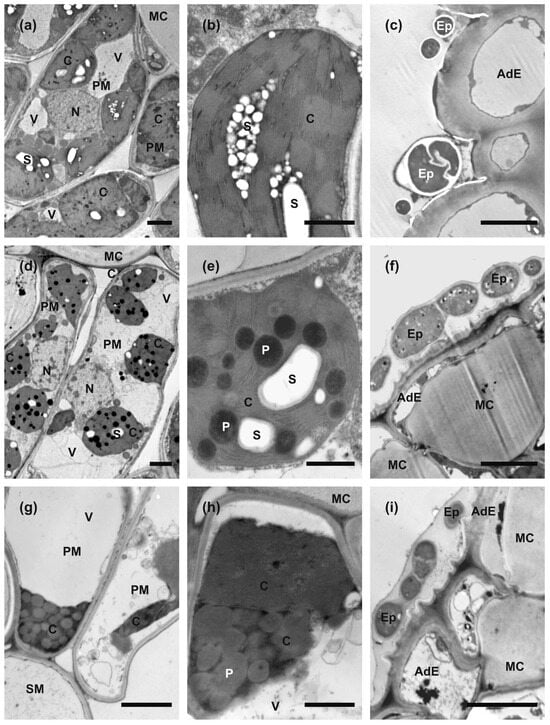 Figure 3. Transmission electron microscopy images of sections taken from summer green leaf (ac), ‘green island’ induced on autumn senescent leaf (df), and the yellow area of a senescent leaf (gi). (a,d,g) Overview of palisade mesophyll cell ultrastructure. (b,e,h) Overview of chloroplast’s ultrastructure. (c,f,i) Epiphytes located on the surface of adaxial epidermis. Abbreviations: AdE, adaxial epidermis; C, chloroplast; Ep, epiphyte; MC, mucilaginous cell wall; N, nucleus; P, plastoglobuli; PM, palisade mesophyll cell; S, starch grain; SM, spongy mesophyll cell; V, vacuole. Scale bars: 5 μm (c,f,i); 2 μm (a,d,g), and 1 μm (b,e,h).