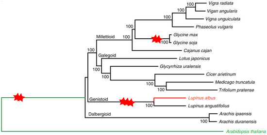 Phylogenetic tree of 16 Legume species. The two red stars represent the whole-genome duplication event, while the three red stars represent the whole-genome triplication event. Arabidopsis thaliana represents an outgroup species in the analysis and was highlighted using a green font, while L. albus has been highlighted using a red font (from [100]).