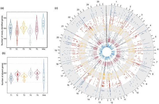 PAV of coding gene in L. albus. (a) Number of newly identified genes by phylogenetic group. (b) Number of absent genes by phylogenetic groups. (c) Positioning of absent genes in the 25 white lupin chromosomes in each 1 of the 39 accessions. Order of accessions from outer to inner track: 1-AMIGA, 2-FEODORA, 3-FIGARO, 4-ENERGY, 5-KIEV MUTANT, 6-HANSA, 7-P21525, 8-PRIMORSKY, 9-DIETA, 10-VOLODIA, 11-START, 12-N3507, 13-TOMBOWSKIJ, 14-KALINA, 15-SYR6258B, 16-LUCKY, 17-MURRINGO, 18-SHINFIELD, 19-ALB01, 20-LUXE, 21-ULYSSE, 22-MAGNUS, 23-CLOVIS, 24-ORUS, 25-NAHRQUELL, 26-GYUNLATANYA, 27-NEULAND, 28-NEUTRA, 29-BADAJOZ, 30-EGY6484B, 31-POUTIGANO, 32-P27174, 33-GERELTA, 34-DOGAN, 35-WADO, 36-GR38, 37-GRAECUS, 38-BATSI, and 39-GRC5262B. The accessions’ colours reflect the six idiotypes. (from [106]).