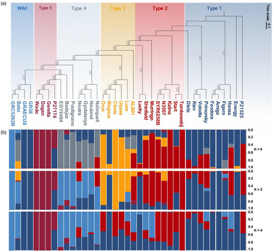 Analysing the genetic structure by performing a Bayesian model-based clustering analysis, Hufnagel and collaborators [106] found that the six population groups matched the maximum-likelihood tree (Figure 5a). This presented evidence of significant admixture in some lines and a weak population structure, a pattern already seen in other studies of L. albus [120]. This weak population structure is also seen through the population-differentiation statistic (FST). The FST value between all six groups was 0.27; however, FST between Type 1 and Type 2 are as low as 0.086, and Type 4 and Wild have an FST of 0.092. Indeed, regarding the Bayesian model, in scenarios dividing the accessions into four or five sub-populations (Figure 5b, K = 4 and K = 5), accessions from Type 4 are merged with the Wild group. On the other hand, Type 5 showed a strong differentiation from the other groups, with FST values ranging from 0.34 to 0.46, with Type 4 and Type 3, respectively, which corroborates the results of previous studies [120].