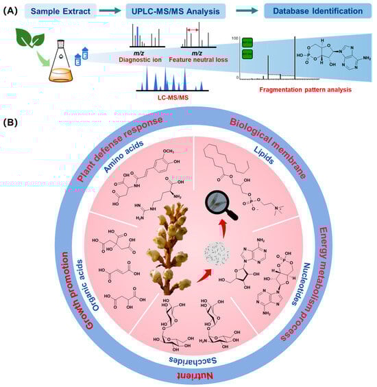 Metabolites analysis process (A) and main primary metabolite types from Gastrodia elata Bl. seeds (B).