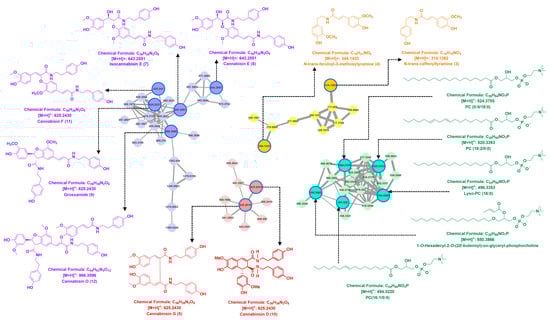 In cluster I, the first lignanamide analog was identified as grossamide (9) by the GNPS-embedded library with the consistent molecular formula (C36H36N2O8) and MS/MS fragment ion (m/z 625 and 462). Then, a trimer lignanamide analog canabisin O (12) was tentatively identified with the same molecular formula (C54H53N3O12) in the literature database []. In addition, a pair of stereoisomers canabisin K (7) and canabisin E (8) were characterized with the same molecular formula (C36H38N2O9) and MS/MS fragment ion (m/z 643, 460, and 314), and the fragment ion at m/z 460 originated from the loss of the 4-(2-aminoethyl)-phenol unit and a molecular of H2O. Structure 11 was speculated as canabisin F with a molecular of H2O (18 Da) less than that of canabisin E (isocanabisin E) []. Similarly, in the cluster II, two nodes were tentatively characterized as canabisin D (10) and G (5) with the same molecular formula (C36H36N2O8), the common neutral loss of 137 Da ([M+H-C8H10NO]), and the same MS/MS fragment ions at m/z 488, m/z 460, and m/z 325 as the literature database []. In cluster III, two nodes showed the molecular formulas of m/z 314 and 344, and they showed the identical ion at m/z 177, which indicated that they could lose the caffeoyltyramine or 3-methoxytyramine group to obtain a trans-feruloyl unit (m/z 177). Thus, N-trans-caffeoyltyramine (3) and N-trans-feruloyl-3-methoxytyramine (4) were tentatively identified based on the same MS/MS fragment pathways and molecular formula as the report []. Finally, in cluster IV, five phospholipids were matched with the GNPS library with the common fragment ions at m/z 184, which matched with the phosphorylcholine unit.