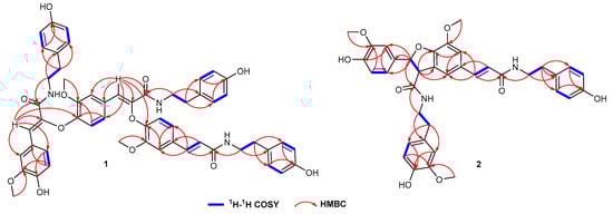 Key 1H-1H COSY and HMBC correlations of 1 and 2.