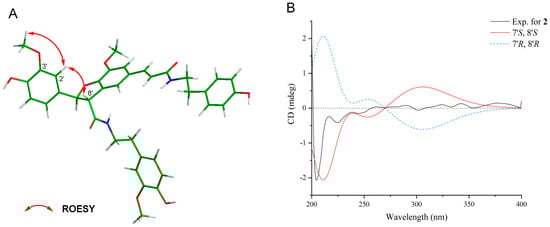 The molecular formula of 2 was determined to be C37H38N2O9 based on the HR-ESI-MS (m/z 677.2489 [M+Na]+). In the 1H-NMR spectrum, the signals for a trans-substituted double bond and a pair of trans-oriented oxy-methine appeared as two sets of doublet peaks at δH 7.40 (J = 15.5 Hz, H-7) and 6.36 (J = 15.5 Hz, H-8′) and at δH 5.88 (J = 8.5 Hz, H-7′) and 4.14 (J = 8.5 Hz, H-8′), respectively (Figure S7). Four ortho-coupled protons were present at δH 6.71 (H-3″, 5″), and 7.07 (H-2″, 6″), which revealed two para-substituted benzene rings. Six aromatic protons at δH 6.75 (1H, dd, J = 8.5, 2.0 Hz, H-6′), 6.79 (1H, d, J = 8.5 Hz, H-5′), and δH 6.91 (1H, d, J = 2.0 Hz, H-2′), and at 6.65 (1H, dd, J = 8.0, 2.0 Hz, H-6‴), 6.74 (1H, d, J = 8.0 Hz, H-5‴), and 6.81 (1H, d, J = 2.0 Hz, H-2‴) suggested the presence of two 1,3,4-trisubstituted benzene rings. Furthermore, two singlets at δH 7.11 (1H, d, J = 2.0 Hz, H-6), 6.70 (1H, d, J = 2.0 Hz, H-2) indicated a 1,3,4,5-tetrasubstituted benzene ring. Additionally, the presence of two NHCH2CH2 segments was indicated by two pairs of vicinal methylenes δH 2.76 (2H, t, H-7″) and 3.49 (2H, t, H-8″) and 2.82, 2.74 (2H, H-7‴), and 3.59, 3.47 (2H, H-8‴). The HMBC correlations from H-7‴ to C-2‴ and C-6‴, from H-8‴ to C-1‴ and C-9′, and from 3‴-OMe to C-3‴ revealed an N-trans-feruloyltyramine-like unit. The HMBC correlations from H-7 to C-9, C-6, and C-2, and from H-8 to C-9 and C-1 revealed an N-trans-caffeoyltyramine-like unit. The correlations from H-8′ to C-5, C-1′, and C-9‴ from H-7′ to C-2′, C-6′, and C-9′ suggested a grossamide-like unit. These data exhibited that compound 2 belonged to the lignanamide family. Except for the presence of an additional methoxy signal (δH 3.82, δC 56.4) in 2, the signals in 1H and 13C-NMR of 2 were similar to grossamide [,]. This hypothesis was supported by the key HMBC correlation from 3‴-OMe to C-3‴ (Figure 4 and Figures S8–S11). The confirmation of H-8′ on the same face as H-2′ and H-6′ was based on the ROESY correlations from H-8′ to H-2′ (Figure 5A and Figure S12). Thus, the relative configuration of compound 2 was determined. The absolute configuration of 2 was determined by comparing the ECD spectrum recorded in MeOH and the DT-DFT-calculated spectrum of 2 at the B3LYP/6-311+G(2d,p) level [,]. The calculated ECD spectrum of 2 matched with the experimental ECD spectrum (Figure 5B), which suggested its stereochemistry to be 7′S and 8′S. Based on the compound name order in the literature, this compound was named cannabisin S.