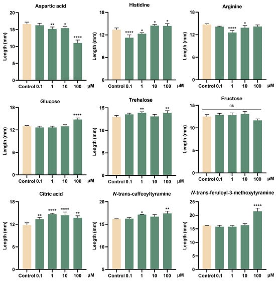 The content proportion of fat acids, protein, and polysaccharides in the G. elata Bl. seeds has been reported through soxhlet extraction and other ways []. In this work, the primary metabolites were investigated by the metabolomic method for the first time, which could pave the way for the discovery of potential signaling molecules in the symbiotic relationship between G. elata Bl. and its seed germination fungus. Thus, several primary metabolites including aspartic acid, histidine, arginine, glucose, trehalose, fructose, and citric acid were selected for bioactive tests on seed germination fungus M. osmundicola and plant pathogen F. oxysporum.