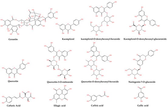 - Graça, V.C.; Ferreira, I.C.; Santos, P.F. Phytochemical composition and biological activities of Geranium robertianum L.: A review. Ind. Crops Prod. 2016, 87, 363–378. [Google Scholar] [CrossRef]