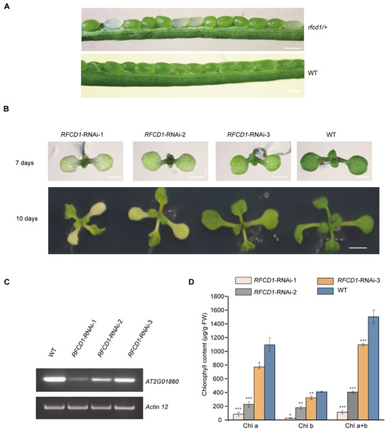 Characterization of the RFCD1-RNAi transgenic plants. (A) A heterozygous rfcd1/+ mutant silique showing that approximately one-quarter of the ovules are albino compared to that of wild-type (WT, ecotype Columbia). Scare bars, 0.5 mm. (B) Identification and isolation of RNAi lines with different degrees of inhibition of RFCD1. Plants were grown on MS medium with 2% (w/v) sucrose for 7 days and 10 days. Scale bars: 1 mm for 7 days and 2 mm for 10 days. (C) Reverse transcription-PCR analysis. RT-PCR was performed using specific primers for AT2G01860 or ACTIN12 for 35 cycles for WT and RNAi lines with different degrees of decrease in RFCD1 expression. (D) Chlorophyll content of WT and RFCD1-RNAi seedlings. Chlorophyll was extracted and quantified from cotyledons of 7-day-old seedlings. Values (means ± SE; n = 3 independent biological replicates) are μg per g fresh weight. The asterisks indicate significant differences between WT and RFCD1-RNAi-1. *** p < 0.001, ** p < 0.01, * p < 0.05, by Student’s t-test.