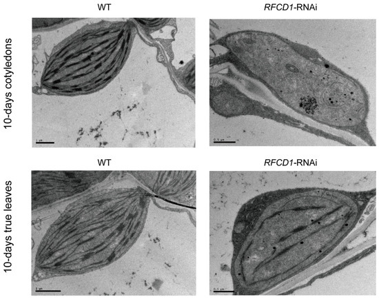 Chloroplast ultrastructure in cotyledons and true leaves from 10-day-old seedlings of the WT and RFCD1-RNAi-1 line. Scale bar: 1 µm for WT and 0.5 µm for RFCD1-RNAi-1.
