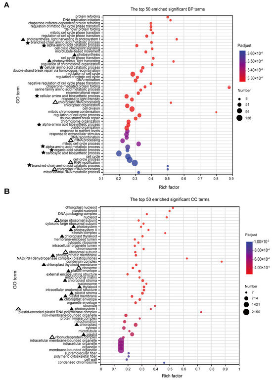 GO enrichment analyses for DEGs. (A) The top 50 enriched significant GO BP terms. The terms related to photosynthesis are marked by ‘▲’. The terms related to amino acid metabolism are marked by ‘★’. The terms related to ribosome are marked by ‘△’. (B) The top 50 enriched significant GO CC terms. Those related to photosynthesis are marked by ‘▲’. Those related to ribosome are marked by ‘△’. The size of the dots in (A,B) represents the number of genes included in the GO term. The rich factor in (A,B) represents the ratio of the number of target genes to the total genes annotated in a pathway. The details of each gene are presented in Table S1.