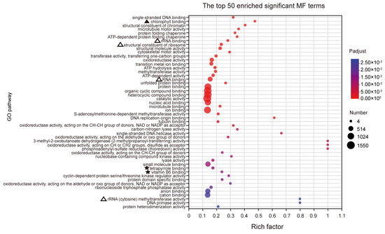 GO analyses for DEGs. The top 50 enriched significant GO MF terms. The terms related to chlorophyll binding are marked by ‘▲’. The terms related to chlorophyll synthesis and vitamin binding are marked by ‘★’. The terms related to ribosome are marked by ‘△’. The details of each gene are presented in Table S1.