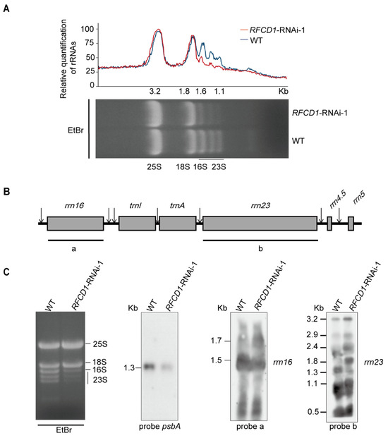 Chloroplast ribosomal RNAs are co-transcribed as a single RNA precursor that contains 16S rRNA, two tRNAs, 23S, 4.5S, and 5S rRNAs (Figure 9A). After transcription, the precursor transcript undergoes a series of maturation processing events [36]. During this process, a 23S–4.5S bi-cistronic RNA (3.2 kb) undergoes endonucleolytic cleavage to produce a mature 4.5S rRNA and a 23S precursor (2.9 kb). This 2.9 kb precursor finally produces three species of RNA (1.3 kb, 1.1 kb, and 0.5 kb), while the mature 16S rRNA (1.5 kb) is processed from the 16S precursor RNA (1.7 kb) [37].