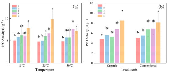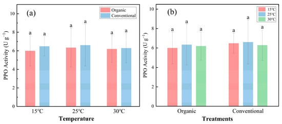 Effect of temperature and cultivation method on PPO activity. (a) represents the effect of organic and conventional cultivation on PPO activity at different temperatures. (b) represents the effect of individual temperatures on PPO activity under two cultivation methods. Organic: organic farming management; Conventional: conventional farming management. Within a given fraction, bars with the same lowercase letter at the top do not differ at p = 0.05. Error bars in the figure represent the standard deviation. (n = 90).