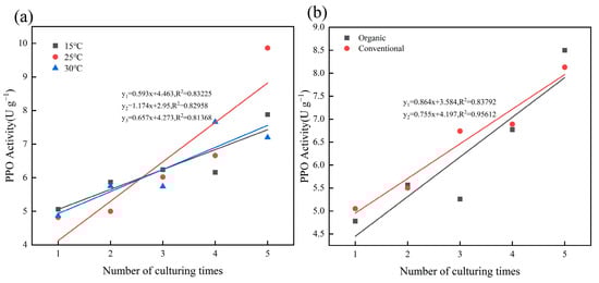 Correlation between different culturing times and PPO activity. (a) represents the relationship between different temperatures; (b) represents the relationship between different cultivation methods.