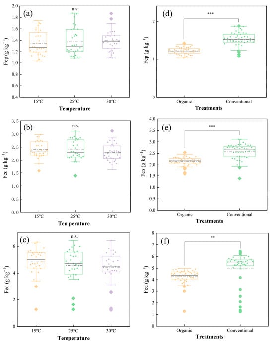 Effect of temperature and cultivation method on iron oxide concentration. (a–c) represent the effect of different temperatures on the contents of Fep, Feo, and Fed. (d–f) represent the effect of different cultivation methods on the contents of Fep, Feo, and Fed. Organic: organic farming management; Conventional: conventional farming management. The value bars with ns are not significant; asterisk denotes statistically significant difference. n.s. p > 0.05; ** p < 0.01; *** p < 0.001. Error bars in the figure represent the standard deviation. (n = 90 per Fe oxide fraction).