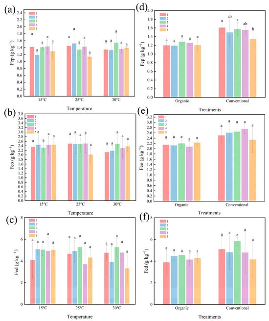 Effect of different culturing times on the activity of iron oxides. (a–c) represent the effect of culturing time at different temperatures on Fep, Feo, and Fed. (d–f) represent the effect of culturing time on Fep, Feo, and Fed under different cultivation methods. Organic: organic farming management; Conventional: conventional farming management. The different numbers represent the order in which the samples were taken, five times in total. Bars with the same lowercase letter at the top do not differ at p = 0.05. Error bars in the figure represent the standard deviation. (n = 90 per Fe oxide fraction).
