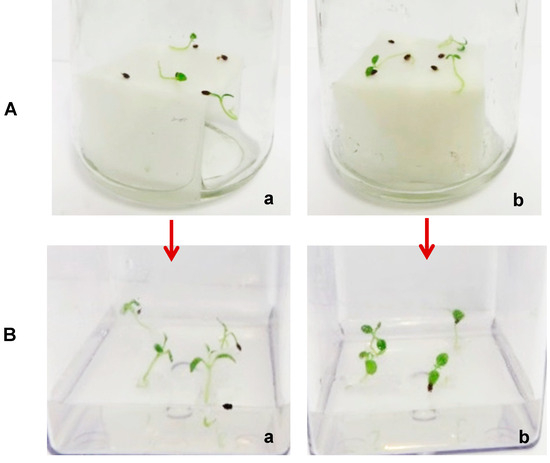 Examples of in vitro culture of Actinidia chinensis from different treatments: (a) combination of 28 days with 500 ppm GA3; (b) combination of 42-day CS with 500 ppm GA3; (A) seeds germinated on filter paper bridges; (B) in vitro developed seedlings after subculturing of germinated seeds into full-strength PGR-free MS medium for 4 weeks.