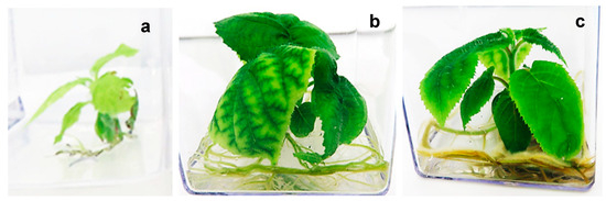Seedlings derived from seeds germinated directly on PGR-free MS medium (control) developed over a period of 9 weeks and were characterised by weaker roots, thin stems and smaller leaves exhibiting symptoms of chlorosis (Figure 2a). In contrast, seedlings derived from seeds germinated on filter paper bridges and transferred thereafter to MS culture media supplemented with 2.2 µM and 4.4 µM BAP developed over a period of 5 weeks and had well-established roots and thicker stems with bigger leaves (Figure 2b,c), when compared to the seedlings on PGR-free (control) medium (Figure 2a). Leaves from seedlings grown in MS medium supplemented with 2.2 µM BAP (Figure 2b) showed symptoms of interveinal chlorosis, whereas only mild marginal chlorosis was observed on seedlings grown on MS medium supplemented with 4.4 µM BAP (Figure 2c).