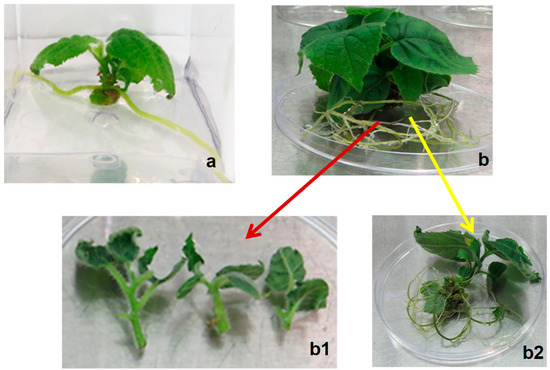The subculture of apical (+A) and basal (−A) shoot explants transferred to a fresh MS medium with 2.2 µM BAP resulted in rapid leaf proliferation after only two weeks in culture. Further incubation of apical (+A) shoot explants in this culture medium for up to 10 weeks resulted in rooting and regeneration of a single plantlet per explant (Figure 3a). The basal shoot explant elongated and rooted after 10–12 weeks (Figure 3b). Multiple axillary shoots (2–3) per explant were induced on these explants grown in the presence of 2.2 µM BAP for 12 weeks, which can serve as a secondary explant source (Figure 3(b1,b2)).