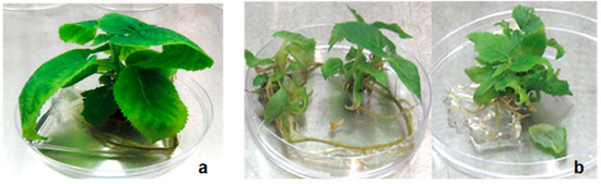 The in vitro multiplied shoots were excised from the mother plant and rooted on a PGR-free MS medium. Successfully rooted plantlets were removed gently from the culture medium and carefully washed with dH2O to remove excess agar. Plantlets with developed adventitious roots were then transferred to 5 cm diameter plastic pots filled with moist vermiculite and kept under controlled conditions at 24 ± 2 °C and 16 h photoperiod of 150–200 µmol m−2 s−1 light intensity. The plantlets were covered with transparent plastic bags, which were gradually opened daily until complete removal to ensure adaptation of plants from in vitro to in vivo conditions. Once the plantlets had fully acclimatised, they were transferred to a greenhouse for further hardening and plant development in vivo.