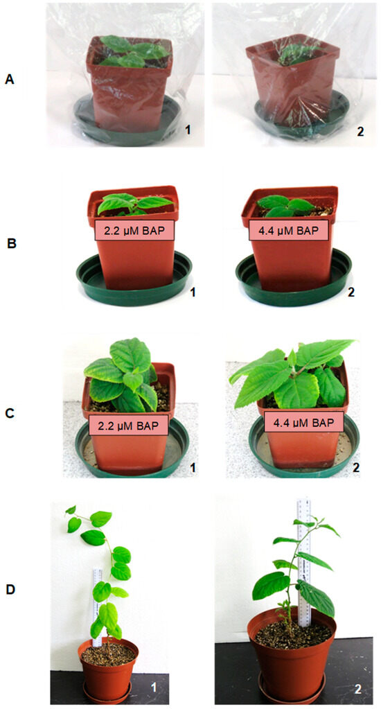 Acclimatisation of in vitro-regenerated plants of Actinidia chinensis from different BAP treatments: (1) 2.2 µM BAP; (2) 4.4 µM BAP: (A) Plantlets from in vitro culture transplanted to pots filled with vermiculite; (B) plants two weeks after the removal of plastic bags; (C) acclimatised plants (after 5 months); (D) fully acclimatised plants (11 months) ready to be transferred to a glasshouse.