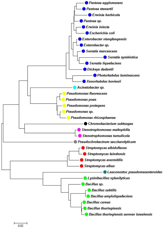 The Enterobacteriaceae are a large family of Gram-negative, non-spore-forming bacteria; they are ubiquitous and are distributed across diverse ecological niches in both terrestrial and aquatic environments [47,48]. Although many species are part of the natural microbiome of animals, including humans, some of them are frequently associated with both intestinal and extraintestinal diseases [49]. Furthermore, they can be pathogens against different groups of insects, including aphids. For example, in research by Harada and Ishikawa [50], the pathogenicity of five strains that were isolated from the gut of multiple specimens of the pea aphid Acyrthosiphon pisum caused up to 80% mortality in this species when they were applied at a concentration of 105 CFU mL−1 in an artificial diet. Furthermore, the results of biochemical tests showed that these strains are related to Erwinia herbicola and Pantoea agglomerans.