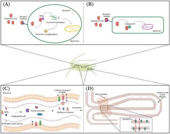 The figure illustrates the modes of action of Bacillus thuringiensis bacterial pesticidal proteins (BPPs), specifically Cry41-related toxins (A,B) and characteristics of the aphid gut that hinder the efficient bonding of BPPs (C,D). (A) Upon ingestion by aphids, a portion of the Cry41-related toxin gains access to the mycetocyte and Buchnera via an unidentified receptor (receptor 1). Subsequently, it interacts with ATP-dependent 6-phosphofructokinase (PFKA), reducing its activity within Buchnera. This enzymatic interaction results in the accumulation of fructose-6-phosphate upstream, leading to impaired cell viability and a subsequent decrease in the population of Buchnera. (B) Cry41-related toxin may potentially infiltrate aphids through another unidentified receptor (receptor 2). Upon entry, it interacts with cathepsin B, enhancing Cry41-related toxin activity. This heightened enzymatic activity accelerates apoptosis within aphid cells, ultimately resulting in the demise of aphid nymphs. (C) Possible reasons for the limited toxicity of BPPs against aphids. (D) The diagram depicts a filter chamber located at the junction between the posterior and anterior midgut, with red arrows indicating the direction of water movement. The figure was created and adapted using information from [22,24].