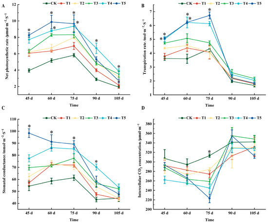 At 45 days after flowering, the transpiration rate of the T4 and T5 treatments was significantly different from that of CK, and both were 28.89% higher than that of CK. At 60 days after flowering, the transpiration rate of each treatment was higher than that of CK. There were significant differences between T4 and T5 treatments and CK, which increased by 42.12% and 42.21%, respectively. At 75 days after flowering, the transpiration rates of T1 and T2 treatments were lower than those of CK, but there was no significant difference from CK. There was a significant difference between T5 and CK, which increased by 35.81% compared with CK. From 90 to 105 d, all treatments were higher than CK, but there was no significant difference (Figure 2B).