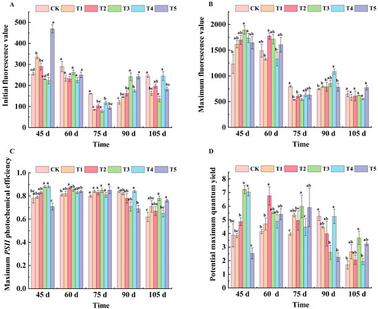 Except for CK, the F0 value of each treatment showed a tendency of decreasing and then increasing. At 45 d after flowering, the F0 values of each treatment were, in order, T5 (469.33), T1 (334.00), T2 (290.67), CK (256.00), T3 (230.00), and T4 (223.14). At 60 days after flowering, the F0 values of all treatments except CK decreased, but there was no significant difference. At 75 d after flowering, the F0 values of all treatments were lower than CK, and T3 treatment was the lowest. At 90 days after flowering, the F0 value of T3 and T5 treatments reached their highest point—both at 242.00—which was significantly different from CK. At 105 days after flowering, the F0 values of the T3 treatment were significantly different from that of CK, and decreased by 44.53% compared with CK (Figure 3A).