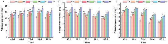 The potassium content in leaves treated with T3, T4, and T5 was significantly different from that of CK at 45 days after flowering, increasing by 20.13%, 21.59%, and 19.48%, respectively (Figure 4C). From 60 to 90 days after flowering, potassium content in leaves of all treatments was higher than that of CK, and there were significant differences between T4 and T5 treatments and CK. At 105 days after flowering, potassium content in leaves was lower on the whole. The potassium content of each treatment was ranked from highest to lowest as T4 (10.60 g·kg−1), T5 (10.55 g·kg−1), T3 (9.19 g·kg−1), T2 (8.01 g·kg−1), CK (7.56 g·kg−1), and T1 (7.17 g·kg−1).