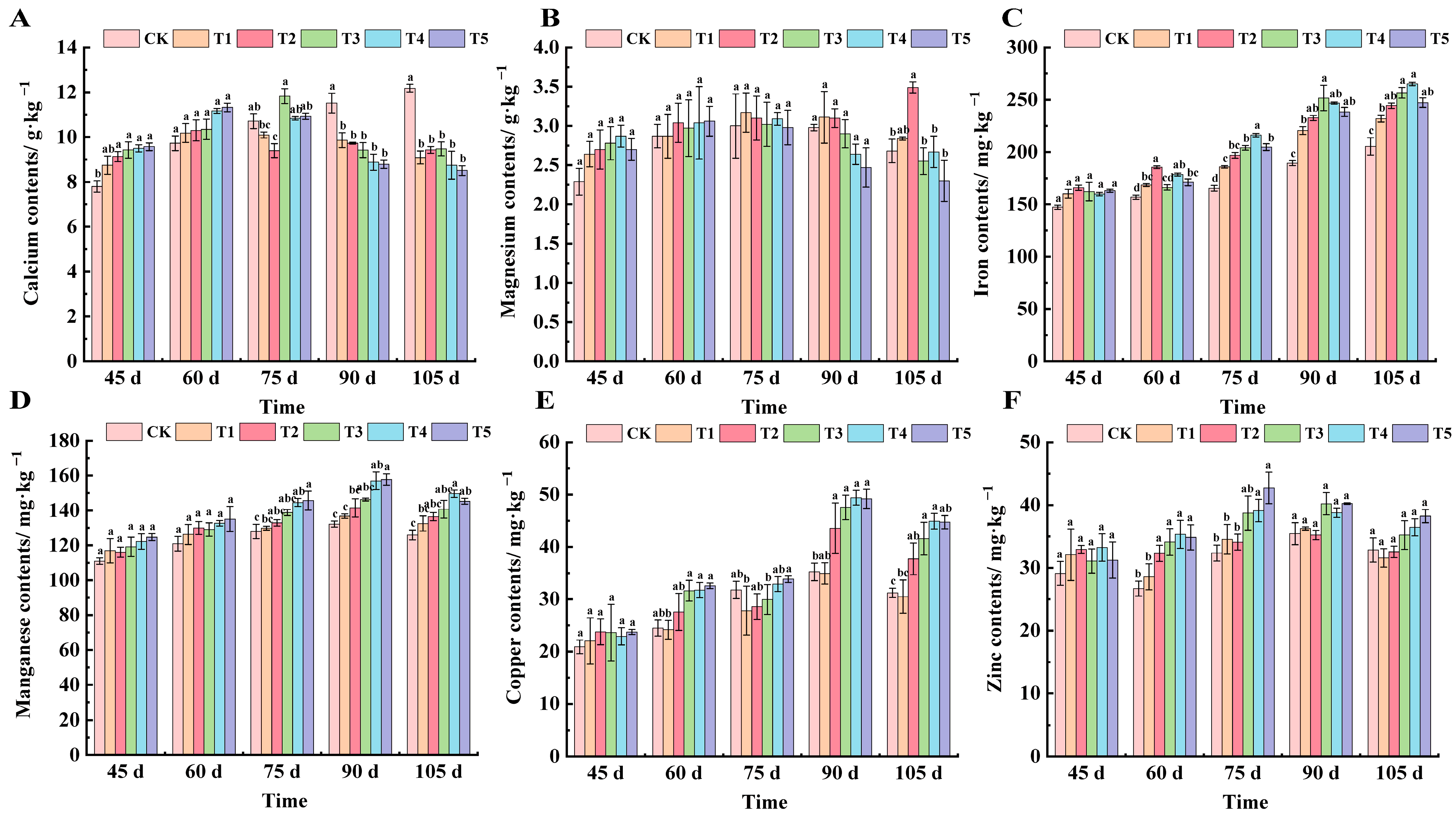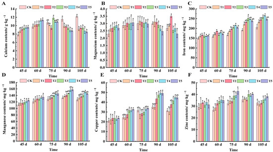 Effect of different treatments on the content of calcium, magnesium, iron, manganese, copper, and zinc in the leaves of ‘Marselan’ grape. (A) represents the calcium content of leaves in 5 periods, (B) represents the magnesium content of leaves in 5 periods, (C) represents the iron content of leaves in 5 periods, (D) represents the manganese content of leaves in 5 periods, (E) represents the copper content of leaves in 5 periods, and (F) represents the zinc content of leaves in 5 periods. Error bars represent the mean ± SE from three biological repeats. Different lowercase letters denote significant differences, whereas the same lowercase letters indicate no statistical difference.