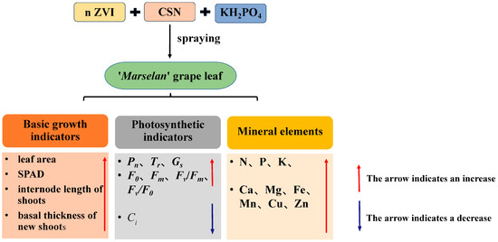 Iron is an essential micronutrient for grape growth, and participates in important processes such as chlorophyll synthesis and respiration. Iron deficiency can cause symptoms such as yellow leaf disease, slow shoot development, and a reduced fruit set [8,9,10,11]. Research on the regulation of plant growth by nanomaterials has become a development trend in sustainable agriculture. Nanoscale zero-valent iron (n ZVI) is a kind of accelerator and reducing agent with superior adsorption properties and high reducibility. Previous studies have shown that 200 mg·L−1 n ZVI can increase the dry matter accumulation of Leonurus heterophyllus plants, and 250 mg·L−1 n ZVI can enhance the chlorophyll a content of Leonurus heterophyllus leaves [12]. According to Hakwon Yoon’s research, a suitable concentration of n ZVI can enhance the photosynthesis of Arabidopsis thaliana grown in soil, thereby increasing plant biomass [13]. Compound sodium nitrophenolate (CSN) is a common plant growth regulator. Jiang Yueshan’s research demonstrated that spraying cucumber seedlings with sodium nitrophenolate improved their growth and enhanced their cold tolerance under cold stress conditions [14]. Batool Zarina believes that spraying CSN on maize leaves under water-deficit conditions can increase the relative water content, chlorophyll content, and carotenoid content of the maize leaves, while also enhancing the yield of maize [15]. Potassium dihydrogen phosphate (KH2PO4) is a high-efficiency phosphorus potassium compound fertilizer, which is generally used to improve the transport of photosynthetic products. Experiments have been conducted using “Cabernet Sauvignon” grapes as experimental material. The results indicated that spraying KH2PO4 on the leaves during the color-changing period could enhance the anthocyanin content in the fruit [16]. In a study of Stevia rebaudiana, the author posits that low concentrations of KH2PO4 can foster plant growth, enhance the content of chlorophyll and carotenoid, and augment the photochemical properties of plants [17].