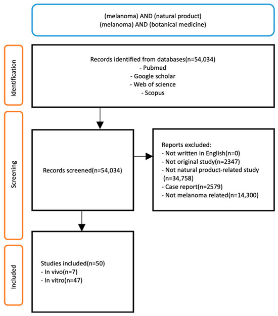 The selection of studies was based on the following inclusion criteria: (1) studies regarding the efficacy of natural products in any dosage form on melanoma cell or patients; (2) preclinical (in vivo, in vitro) studies; (3) isolated natural product; (4) original research articles; (5) articles written in English; (6) articles published within the last 10 years. The exclusion criteria were as follows: (1) articles regarding synthetic compounds; (2) systematic reviews, meta-analyses, review articles, conference papers and case reports; (3) articles in which the full text is unavailable. The resulting articles were revised to manually identify and exclude the articles that did not meet the criteria above. To identify articles of interest, all the articles retrieved from two databases were manually reviewed and checked for duplication.