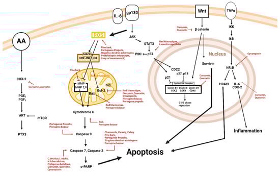 Abbreviations: Bax, Bcl-2-associated X protein; cyt-c, cytochrome c; c-caspase, cleaved caspase; Bcl-2-antagonist/killer; DVL2, dishevelled segment polarity protein 2; β-catenin, beta-catenin; Cox2, prostaglandin–endoperoxide synthase 2; Axin2, axis inhibition protein 2; ROS, reactive oxygen species; Smac, second mitochondria-derived activator of caspase; Diablo, direct inhibitor of apoptosis-binding protein with low pI; γH2AX, phosphorylated histone H2AX; IL-10, interleukin 10; p53, cellular tumor antigen p53; MMP-9, matrix metalloproteinases 9; Bcl-XL, B-cell lymphoma—extra large.