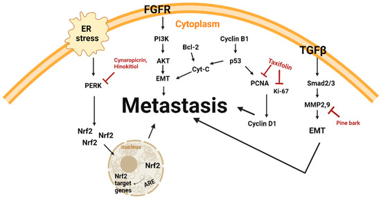 Xu et al. described anti-proliferation and anti-migration in melanoma-induced C57/BL6 mice [38]. Here, 30 mg/kg and 60 mg/kg of taxifolin, extracted from the roots of Larix olgensis, were intraperitoneally injected for 11 days. Proteins Ki67 and PCNA were down-regulated, resulting in the inhibition of metastasis. Silva et al. claimed the anti-metastatic property of Eleutherine bulbosa bulbs in melanoma-induced C57BL6 mice [39]. Mice treated with 100, 500, and 1000 μg/mL of plant extract for 11 days exhibited anti-metastatic effects. Thaichinda et al. reported the anti-metastatic properties of pine bark extract (PBE) in melanoma skin cancer cell migration and invasion [37]. A dose of 50 μg/mL of PBE for 45 h reduced the migration and invasion of A375 cells. Additionally, PBE downregulated MMP-9, a protein expressed by cell lines derived from advanced primary melanomas, thereby reducing cancer cell invasion. De Cicco et al. demonstrated the anti-metastatic effect of cynaropicrin [30]. The natural product inhibited cell proliferation, apoptosis, migration, and invasion, which decreased metastatic activity in A375 cells. The up-regulation of Nrf2 and down-regulation of phosho-ERK and p65 reduced the activation of ERK as well as the translocation of NF-KB into the nucleus, reducing the proliferation of human metastatic melanoma cells. Wu et al. reported hinokitiol’s anti-metastatic properties [40]. Hinokitiol showed an inhibitory effect on cell migration, leading to a decrease in metastatic activity in B16F10 cells. In C57BL/6 mice and BALB/c mice, injecting hinokitiol via the tail vein impeded tumor metastasis, which was shown through a decrease in the weight of the tumors. Proteins phospho-AKT and phospho-ERK were significantly suppressed, acting against cancer-promoting pathways.