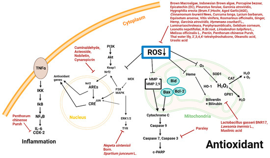 Prasedya et al. reported the antioxidative effect of Sargassum cristaefolium (SCE) on B16F10 melanoma cell [41]. At doses of 1, 10, 50, and 100 μg/mL for an hour, the cellular ROS level in cells exposed to SCE was significantly downregulated. Sunarwidhi et al. reported the antioxidant effects of Indonesian brown algae on the B16F10 malignant melanoma cell line [42]. Indonesian brown algae at doses of 50, 100, 500, 1000, and 4000 μg/mL for 16 h, evaluated by ABTS scavenging, resulted in augmented antioxidant activity in a dose-dependent manner. Antioxidant activity was here induced through the down-regulation of ROS. Khan et al. reported the antioxidant effects of Hystrix Brachyura Bezoar on the B375 malignant melanoma cell line [18]. Hystrix Brachyura Bezoar at doses of 1, 2, 3, and 4 μg/mL for 72 h, evaluated by dot–blot assays, resulted in antioxidant activity in a concentration-dependent manner. Antioxidant activity was induced through the down-regulation of ROS. Lee et al. claimed the antioxidant effects of Lactobacillus gasseri BNR17 on the B16-F10 melanoma cell line and HaCaT epidermal keratinocyte cell line [43]. Lactobacillus gasseri BNR17, at doses of 0.16, 0.312, 0.625, 1.25, 2.5, 5, and 10% v/v for 24 h, resulted in antioxidant activity in a concentration-dependent manner. Antioxidant activity was induced through the up-regulation of HO-1, CAT, GPX1 and SOD1 and the down-regulation of ROS. Kim et al. confirmed the antioxidative effects that the essential oils of Chrysanthemum boreale MAKINO(CBM) demonstrated in B16BL6 melanoma cells [44]. The antioxidant and anti-melanogenesis properties were evident when exposed to CBM at doses of 1, 10, and 30 μg/mL for 48 h. The effects were exhibited through the down-regulation of TYR and the up-regulation of p38, MAPK, and Erk1/2. Mustapha et al. documented the antioxidative trait of epicatechin extracted from Hawthorn, Crataegus azarolus L., on the melanoma cell line [45]. B16F10 cells were exposed to doses of 10, 20, 30, 40, and 50 μmol/L of epicatechin for 1 h. The ROS level diminished, exhibiting evidence of an antioxidative effect. Arung et al. illustrated the antioxidant effects of Glyasperin A on the B16 malignant melanoma cell line [46]. Glyasperin A at doses of 2.4, 4.8, 6.0, and 7.2 μM resulted in antioxidant activity in a concentration-dependent manner, determined by diphenyl-2-picrylhydrazyl (DPPH), 2,2′-azi- no-bis-3-ethylbenzthiazoline-6-sulphonic acid (ABTS), superoxide dismutase-like activity (SOSA), and oxygen radical absorbance capacity (ORAC) assays. Yang et al. claimed the cellular effects of Pleurotus ferulae in B16 melanoma cells [47]. Doses of 0.5, 1, 2, 5, and 10 μg/mL had antioxidant and antitumor activities by limiting cellular ROS activity. Cheimonidi et al. illustrated the induction of antioxidant activity in the B16F1 and B16F10 cell lines and C57BL/6 mice through exposure to acteoside [48]. Acteoside, at doses of 0.2, 0.4, 0.6, 0.8, and 1 mM for 24 h, resulted in the activation of related proteins in a dose-dependent manner. C57BL/6 mice were intraperitonially injected with acteoside at doses of 1 and 2.5 mg/mouse for 13 consecutive days. Antioxidant activity was induced through the up-regulation of Akt, CREB1, MEK1 and WNK1 and the down-regulation of STAT1 and STAT3. Lee et al. demonstrated the antioxidant effect of Hygrophila erecta [49]. The natural product induced the antioxidant defense system, apoptotic effects, inflammatory responses, and a melanin synthesizing effect in both NHDF and B16F1 cell lines. Hygrophila erecta at doses at doses of 1, 2, 4, 8, 16, 31, 62, 125, 250, 500, and 1000 μg/mL for 24 h resulted in the suppression of ROS levels and NO concentration associated with the activation of SOD and Nrf2. Ohkubo et al. reported the antioxidant effects of aged garlic extract (AGE) on the human malignant melanoma M14 wild type cell line [21]. AGE extract at doses of 1, 5, and 10 mg/mL for 40 min induced oxidative stress by decreasing mitochondrial sulfhydryl groups in a dose-dependent manner. Antioxidant activity was induced through the down-regulation of ROS. Kaushik et al. demonstrated the antioxidant effects of Cinnamomum loureirii Nees on the G361 malignant melanoma cell line [28]. Cinnamomum loureirii Nees at a dose of 1 mg/mL for 30 min, evaluated by DPPH free radical inhibition, resulted in augmented antioxidant activity in a dose-dependent manner. Antioxidant activity was induced through the down-regulation of ROS. Žitek et al. demonstrated the antioxidant effects of Curcuma longa, Lycium barbarum, Equisetum arvense, Vitis vinifera, and Rosmarinus officinalis extracts on the WM-266-4 metastatic melanoma cell line [50]. The extracts from the raw materials, applied at doses of 0.001, 0.01, 0.1, 1, 5, 10, 20, and 100 μg/mL for 24 h, resulted in antioxidant activity in a concentration-dependent manner, mediated through the down-regulation of ROS. Also, Žitek et al. claimed the antioxidant effects of ginger and hemp on the B16F10 malignant melanoma cell line [51]. A combination of hemp extract and ginger, at doses of 0.01, 0.1, 1, 5, 10, 20, and 50 mg/mL for 24 h, exhibited antioxidant activity in a concentration-dependent manner by down-regulating ROS levels. Chatatkun et al. claimed the antioxidant effects of Garcinia atroviridis on the B16F10 malignant melanoma cell line [52] at doses of 62.5, 125, 250, 500, and 1000 μg/mL, in a dose-dependent manner, through free radical scavenging activity, as determined by DPPH and ABTS assays. Antioxidant activity was induced through the down-regulation of ROS. Spera et al. demonstrated the antioxidant effects of Hymenaea courbaril L. on the B16F10 malignant melanoma cell line [53]. Hymenaea courbaril L., at a dose of 250 μg/mL for 30 min, evaluated by DPPH radical scavenging activity, resulted in antioxidant activity in a dose-dependent manner. Antioxidant activity was induced through the down-regulation of ROS. Díaz et al. claimed the 