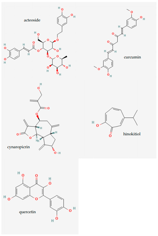 Chemical structures of selected natural compounds with promising anti-melanoma activity: acteoside (PubChem CID: 5281800), curcumin (PubChem CID: 969516), cynaropicrin (PubChem CID: 119093), hinokitiol (PubChem CID: 3611), and quercetin (PubChem CID: 5280343).