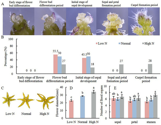 Effects of varying nitrogen concentrations on tomato flowers bud differentiation process (A,B), flower diameter (C,D), and number of floral organs (E). Note: Different lowercase letters indicate significant differences between treatments (p < 0.05).