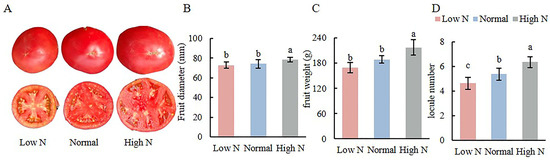Effects of varying nitrogen concentrations on tomato fruit (A), fruit diameter (B), fruit weight (C), and locule number (D). Note: Different lowercase letters indicate significant differences between treatments (p < 0.05).
