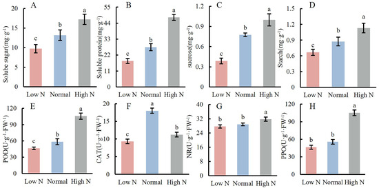 The analysis of nutrient content changes in the stem apex of tomato seedlings revealed that the contents of soluble sugar and soluble protein in high N were significantly increased by 30.8% and 75.2%, respectively, compared to normal. In contrast, the low N conditions resulted in a significant reduction of 26.4% and 34.6% for soluble sugar and soluble protein, respectively, relative to the normal conditions (Figure 3A,B). Furthermore, the contents of sucrose and starch in high N conditions were significantly increased by 28.9% and 29.4%, respectively, compared to normal conditions, while the low N conditions led to significant decreases of 50.2% and 23.7%, respectively, compared to the normal conditions (Figure 3C,D).