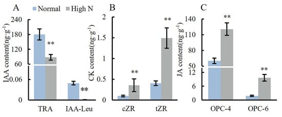 The contents of IAA-Leu and the precursor TRA in high N conditions were significantly reduced by 98% and 51.1%, respectively, compared to normal conditions (Figure 4A). Conversely, the contents of the cytokinin cZR and tZR in high N conditions were both significantly increased, showing an increase of 2.7 times compared to normal conditions (Figure 4B). Additionally, the contents of the Jasmonic acid precursors OPC-4 and OPC-6 in high N conditions were significantly increased by 1 time and 4.5 times, respectively, compared to normal (Figure 4C).