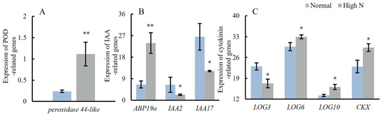 The PRX44-like (peroxidase 44-like) gene, which encodes a peroxidase, was significantly upregulated in high N conditions (Figure 5A). The ABP19a, responsible for encoding the auxin-binding protein ABP19a, was also significantly upregulated in high N conditions. Conversely, the IAA2 and IAA17 genes, which encode auxin-responsive proteins, were significantly downregulated in high N conditions (Figure 5B). LOG3, LOG6, and LOG10 genes encoded cytokinin riboside 5′-monophosphate phosphoribohydrolase; LOG3 was significantly downregulated in high N conditions, whereas LOG6 and LOG10 were significantly upregulated under the same conditions. Additionally, CKX, which encodes cytokinin oxidase/dehydrogenase-like, was significantly upregulated in high N conditions (Figure 5C).