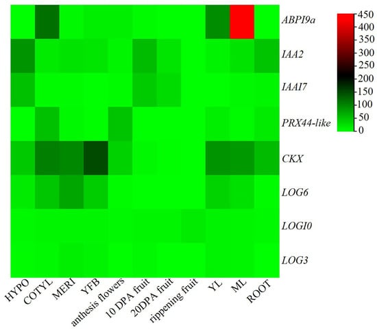 Heatmaps depicting gene expression across various tissues indicated that nine candidate genes were expressed in a total of 11 tissues. Notably, the expression of ABP9a was higher in cotyledons, young leaves, and mature leaves. In contrast, IAA2 and IAA17 exhibited higher expression in hypocotyls, as well as 10 days post anthesis fruits and 20 days post anthesis fruit and roots. Additionally, PRX44-like demonstrated significant expression in cotyledons and anthesis flowers. CKX and LOG6 were found to be more highly expressed in cotyledons, meristems, young flower buds, young leaves, and mature leaves. LOG10 and LOG3 exhibited comparable expressions across all 11 tissues (Figure 6).